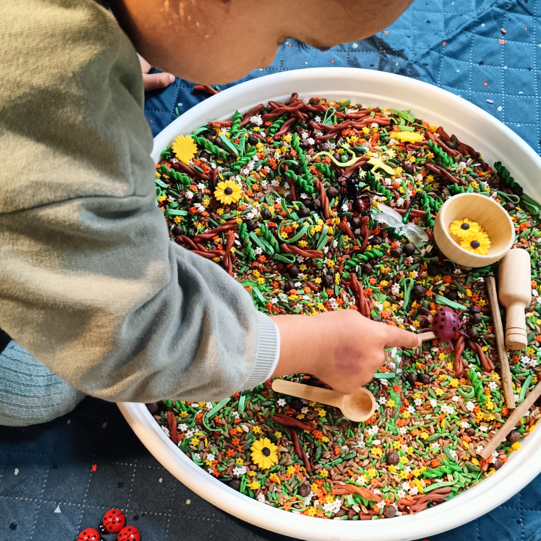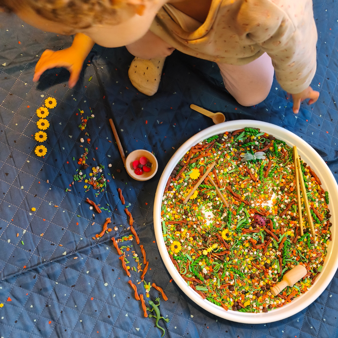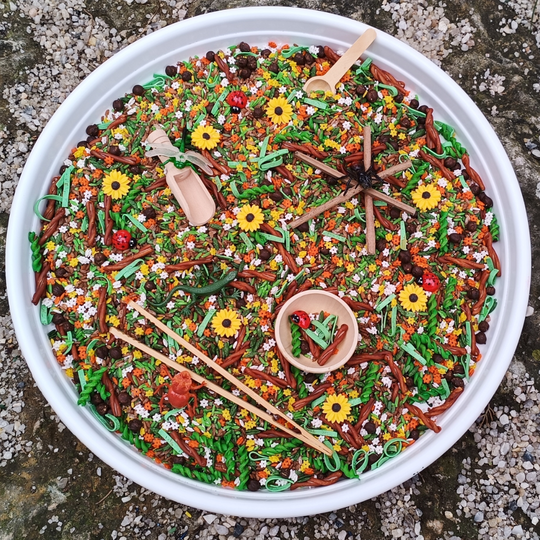 ✅ Base sensorial táctil : una mezcla de pasta, arroz y garbanzos que imita las texturas del suelo del bosque para una experiencia de juego inmersiva.