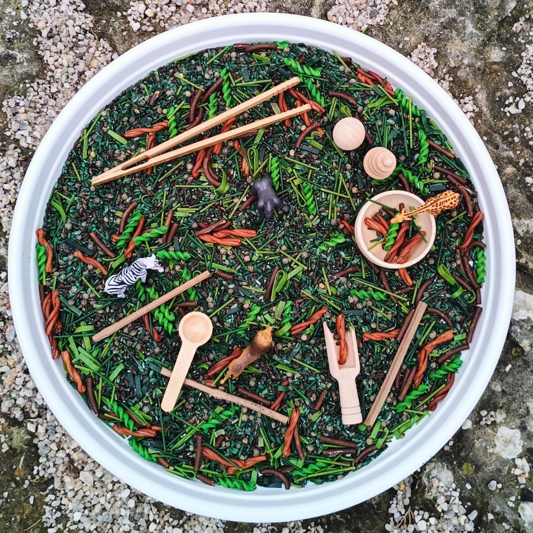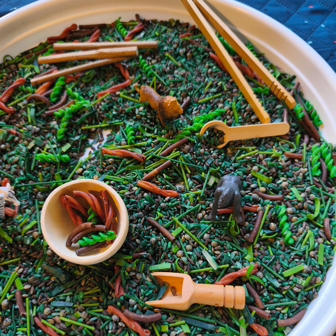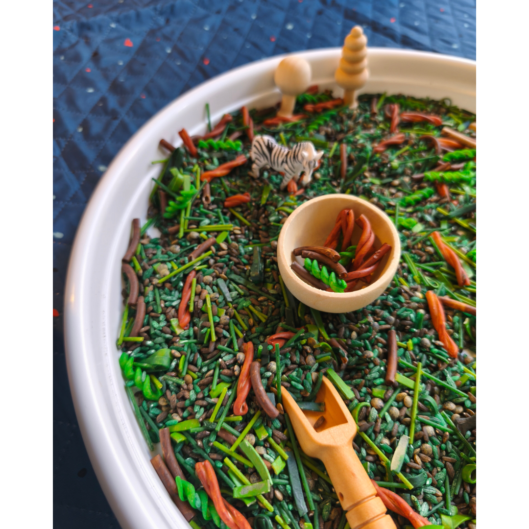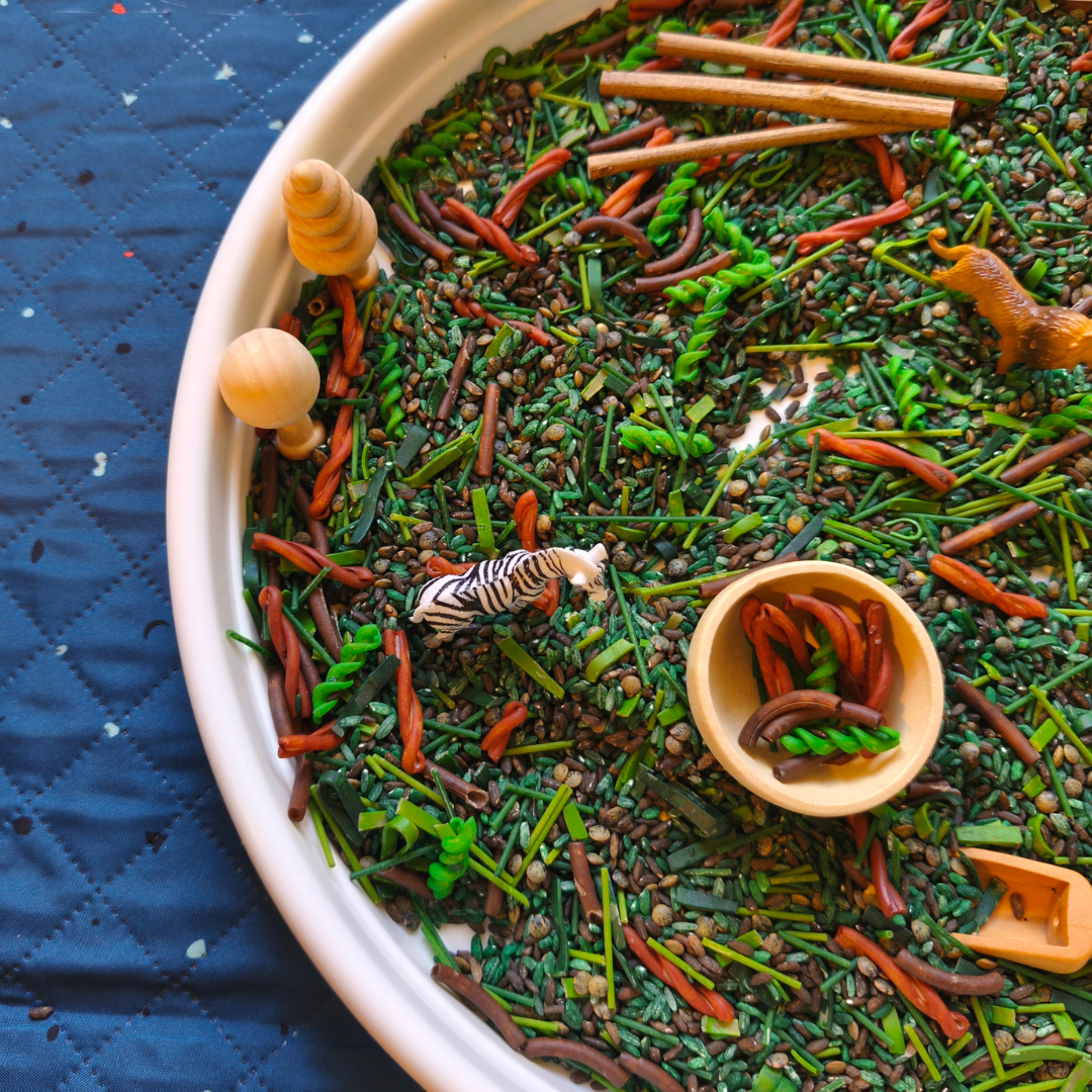 ✅ Base sensorielle tactile – Un riche mélange de pâtes, de riz et de haricots offre une variété de textures pour imiter le sol de la jungle et améliorer la découverte sensorielle.