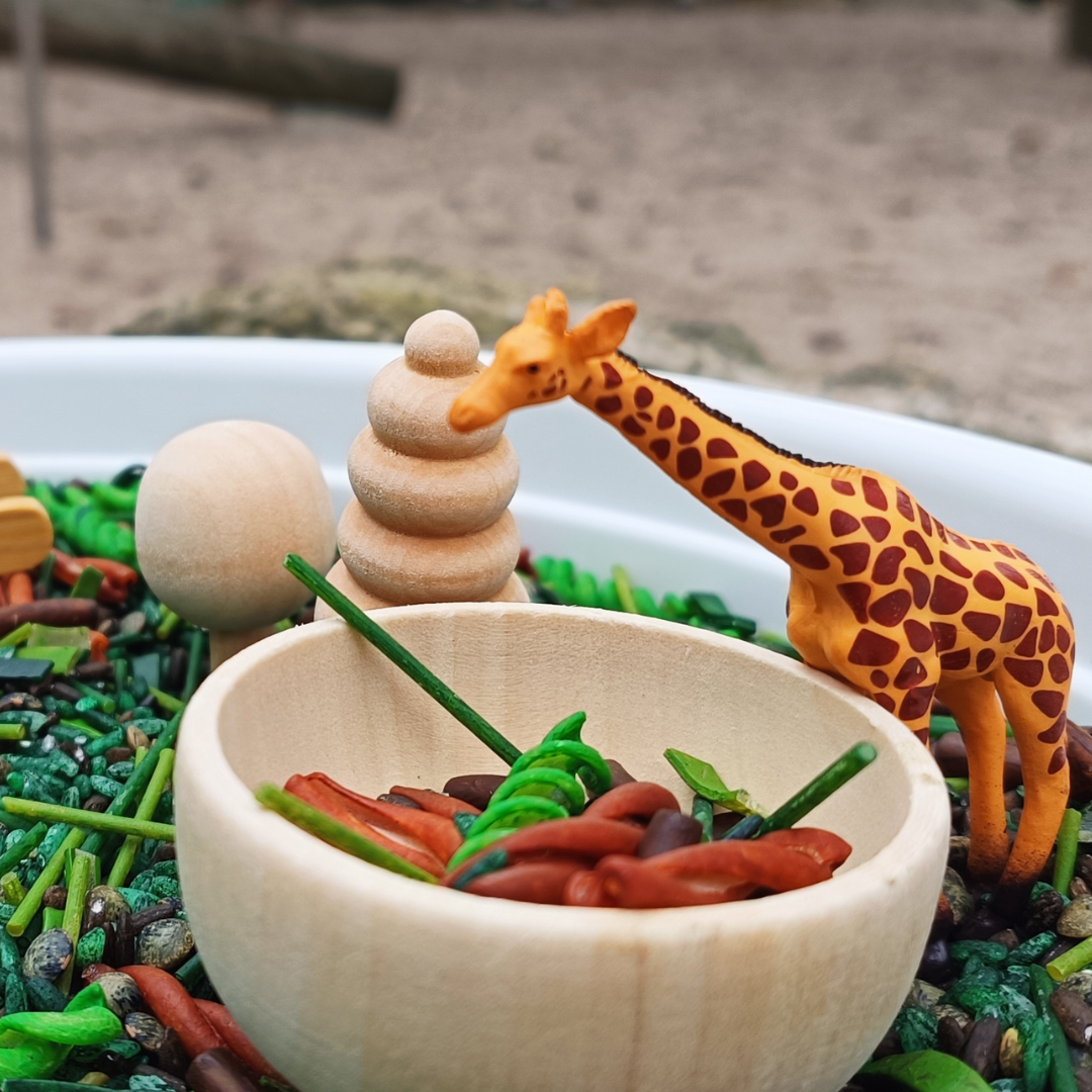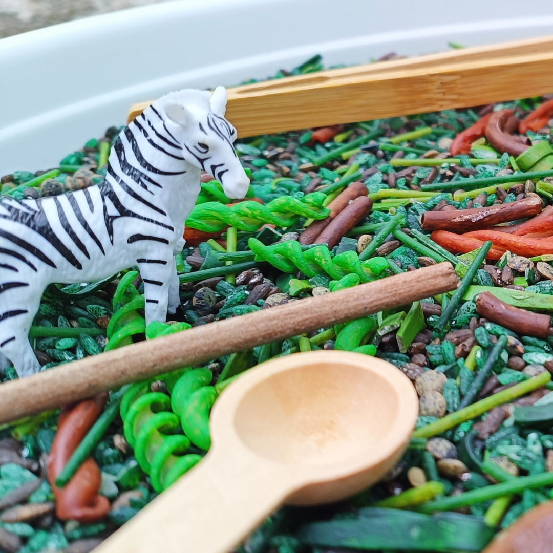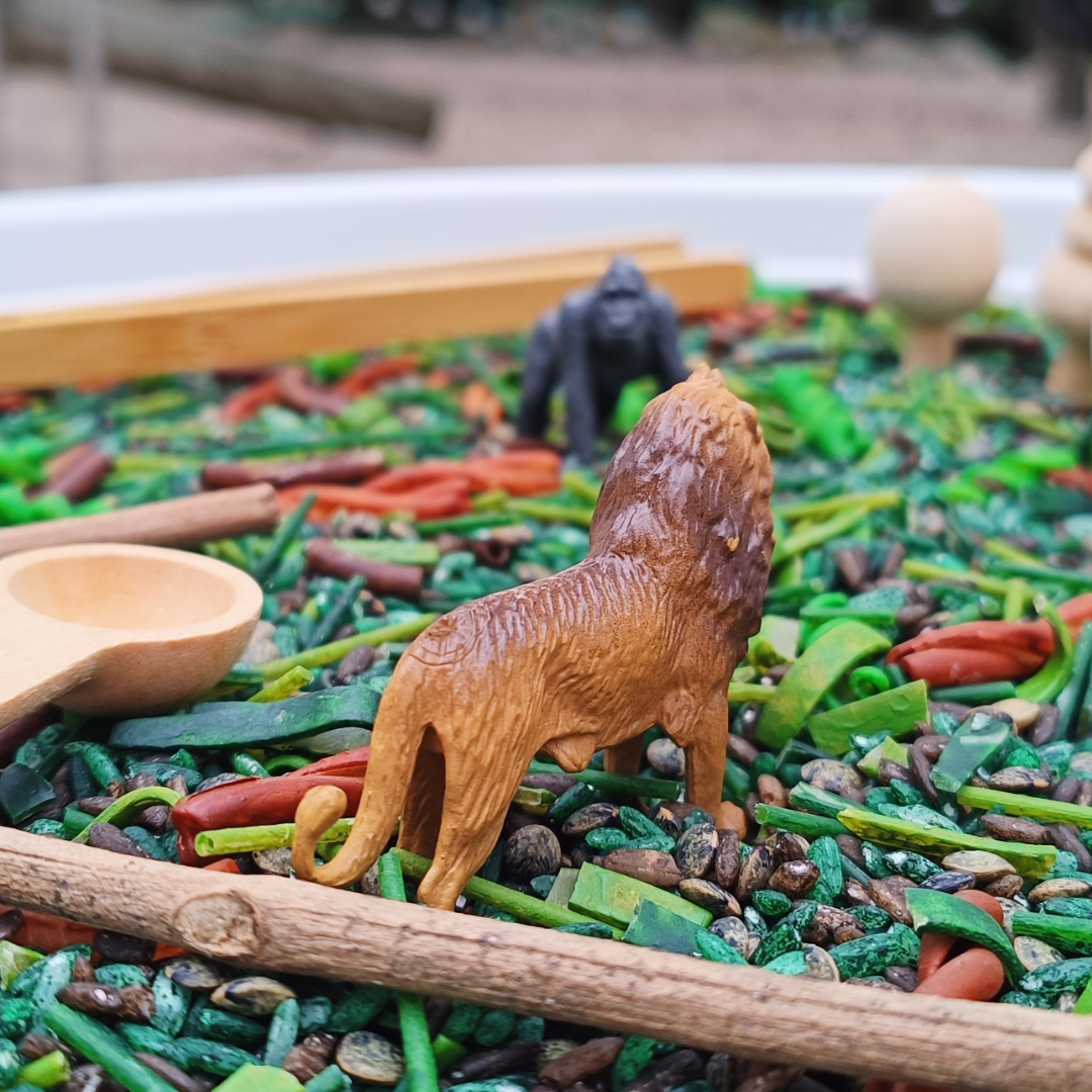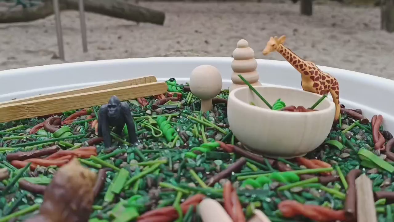 🚫 Plateau non inclus – Utilisez n’importe quelle base en bois, récipient ou bac sensoriel que vous avez à la maison pour mettre en place la scène de la jungle.