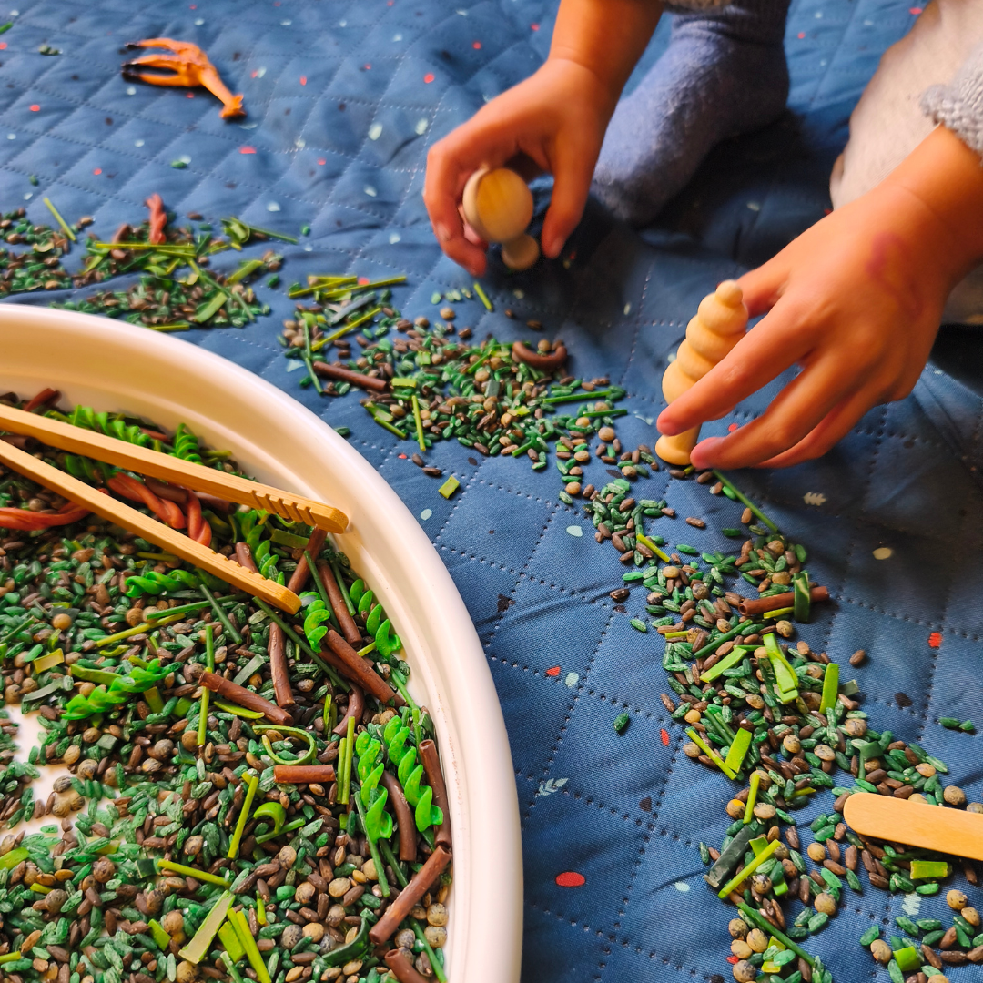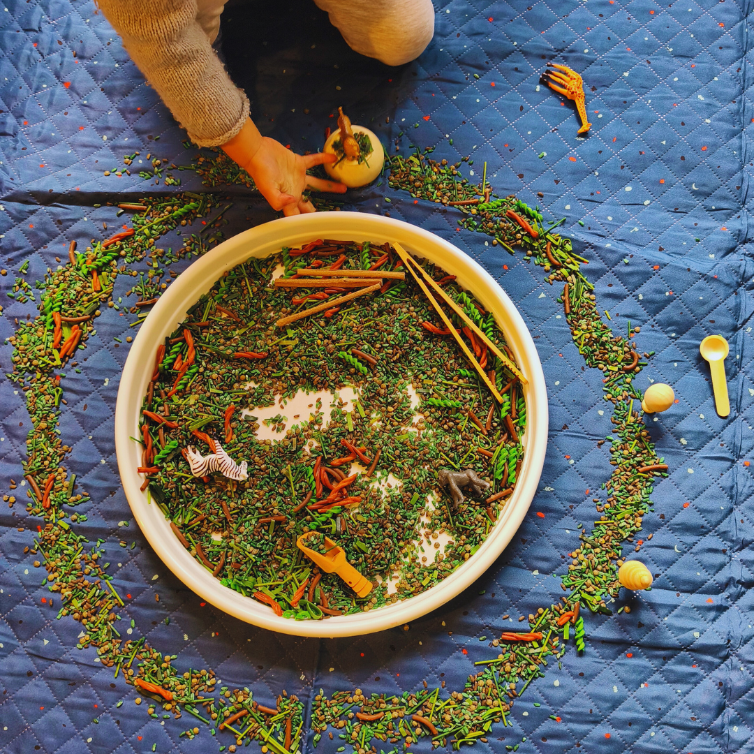 🍃 Base sensorielle texturée – Un mélange de pâtes, de riz et de haricots pour explorer différentes textures.